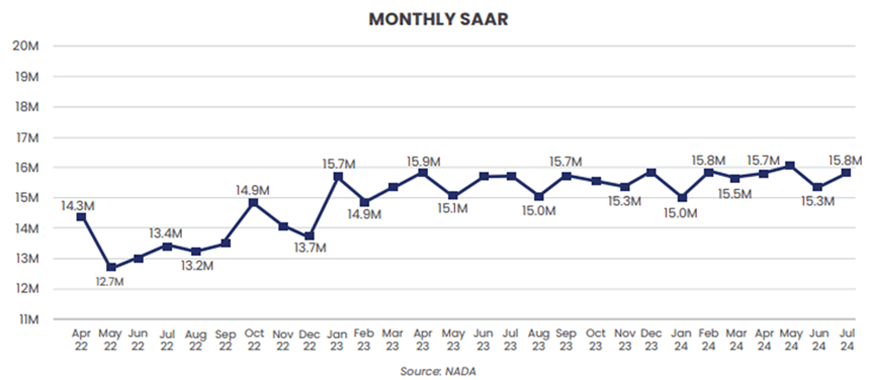 In Q2 2024, the SAAR (Seasonally Adjusted Annual Rate) of new vehicle sales was 15.6M, 0.2M higher than levels recorded in the first quarter. The SAAR jumped slightly to 15.8M in July, perhaps due to a catch up on sales that were delayed in June due to the CDK outage.